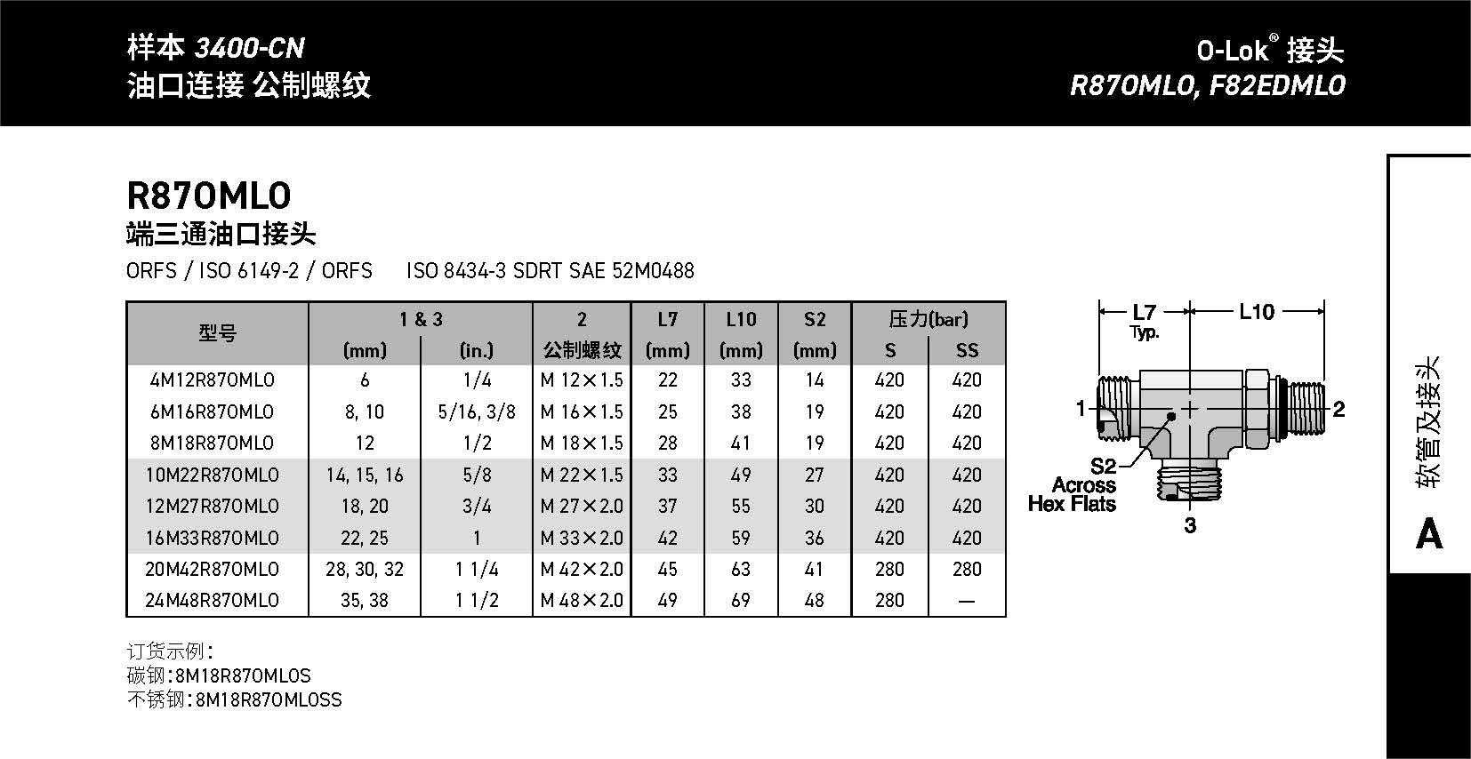 S87OMLO 端三通油口接頭 ORFS / ORFS / ISO 6149-2 ISO 8434-3 SDBT SAE 52M0489