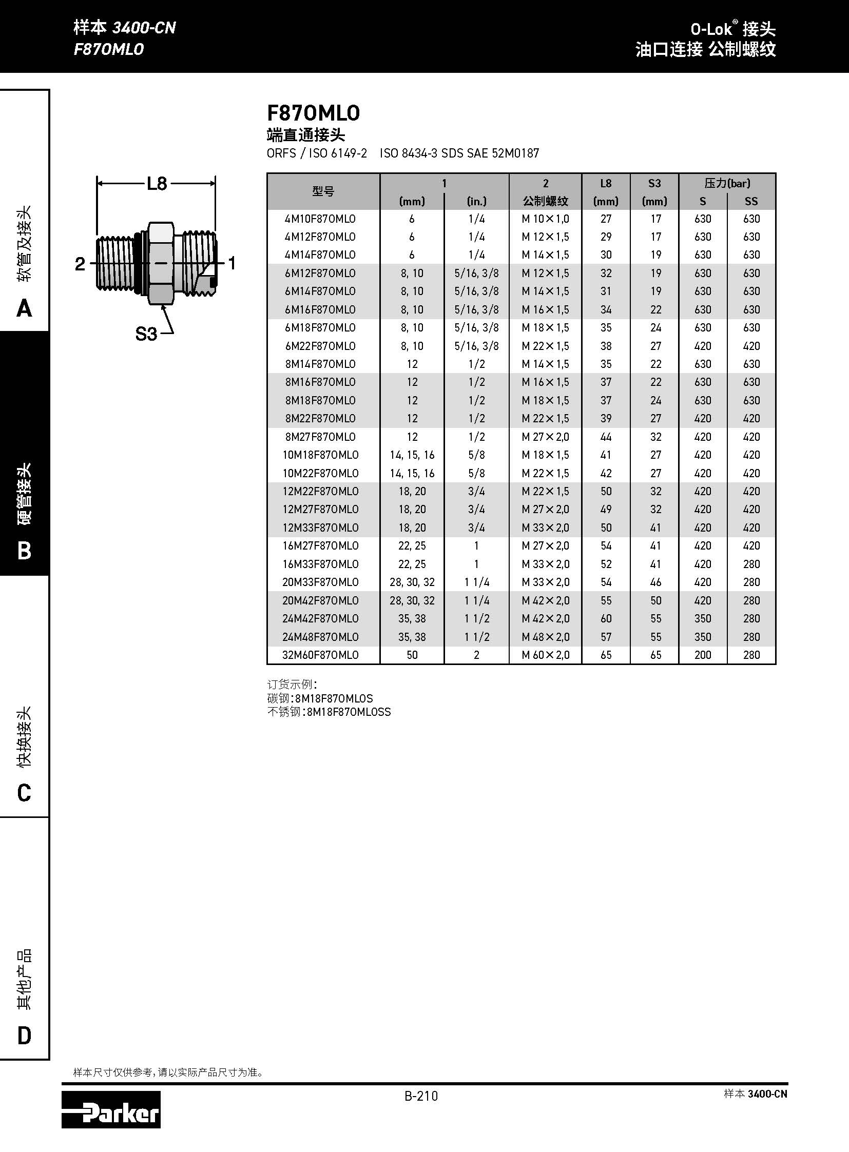 F87OMLO 端直通接頭 ORFS / ISO 6149-2 ISO 8434-3 SDS SAE 52M0187