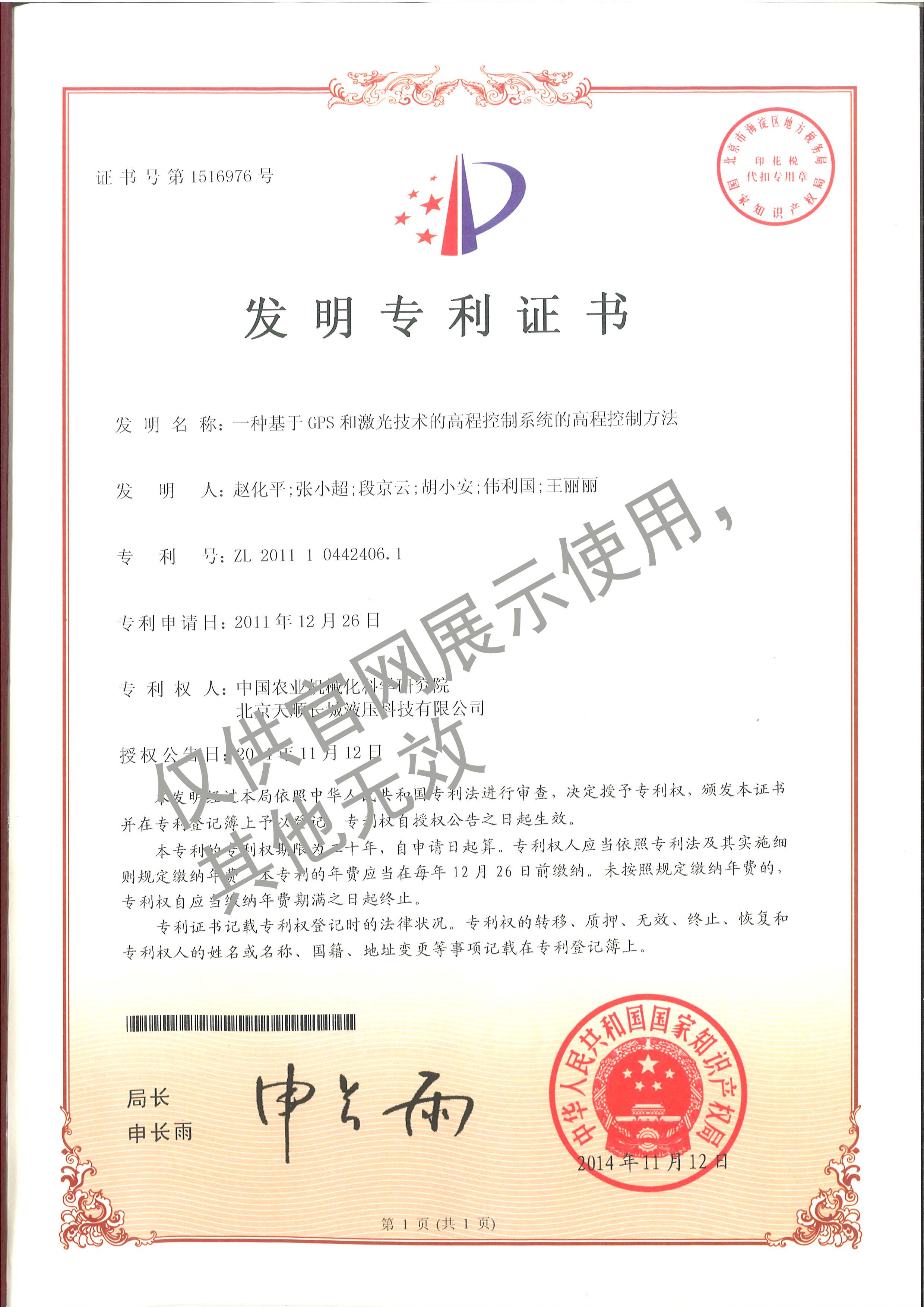 11-ZL201110442406.1發(fā)明專利-一種基于GPS和激光技術(shù)的高程控制系統(tǒng)的高程控制方法20111226