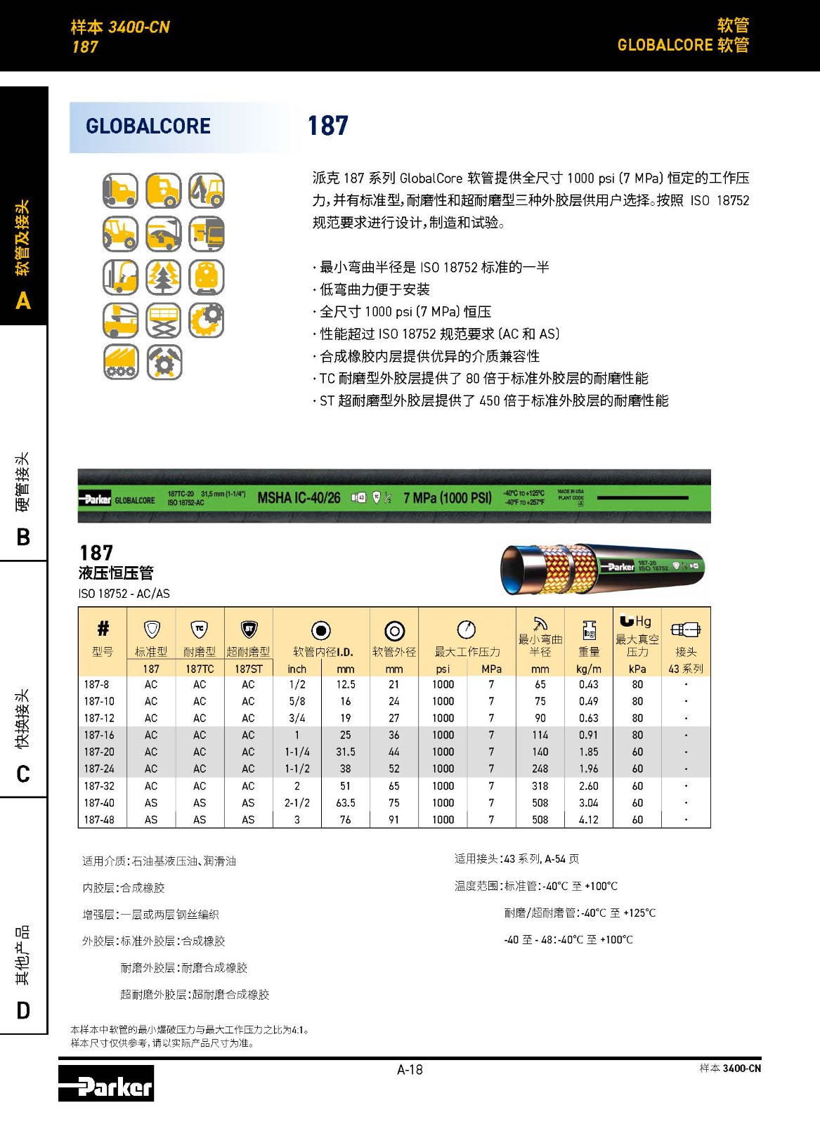 派克 187 系列GlobalCore 軟管提供全尺寸 1000 psi (7 MPa) 恒定的工作壓力,并有標(biāo)準(zhǔn)型,耐磨性和超耐磨型三種外膠層供用戶選擇。按照 ISO 18752 規(guī)范要求進(jìn)行設(shè)計(jì),制造和試驗(yàn)。