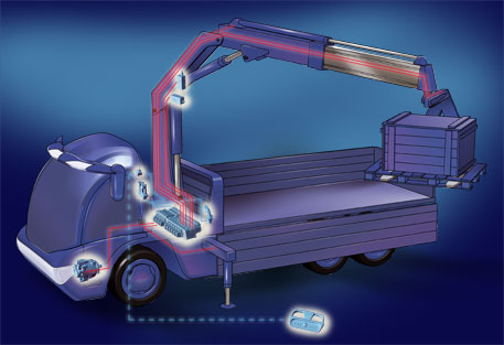 丹佛斯的泵,PVG比例閥及PLUS+1的控制器,顯示器,傳感器及手柄等可運用在汽車起重機中。
